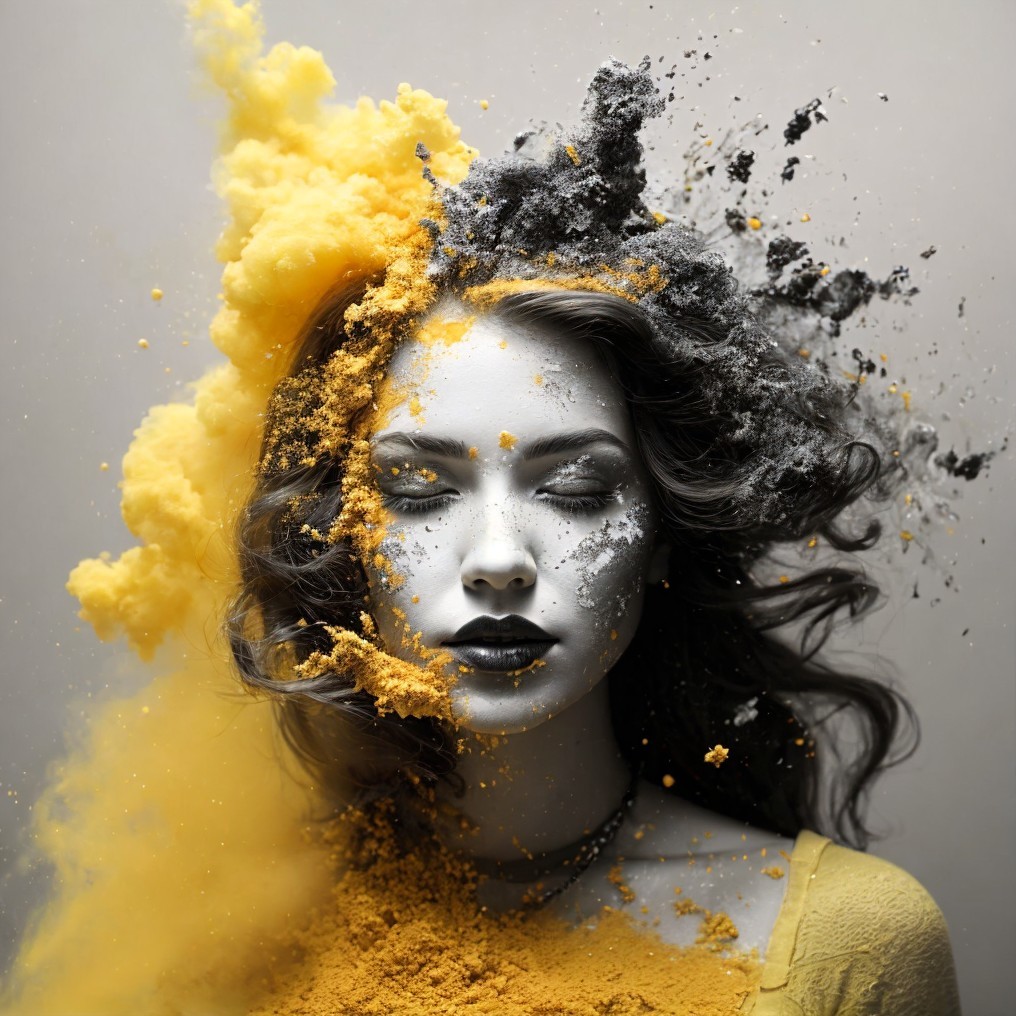 A woman's portrait with yellow and black powder explosion effects around her head, creating an artistic, dynamic composition.