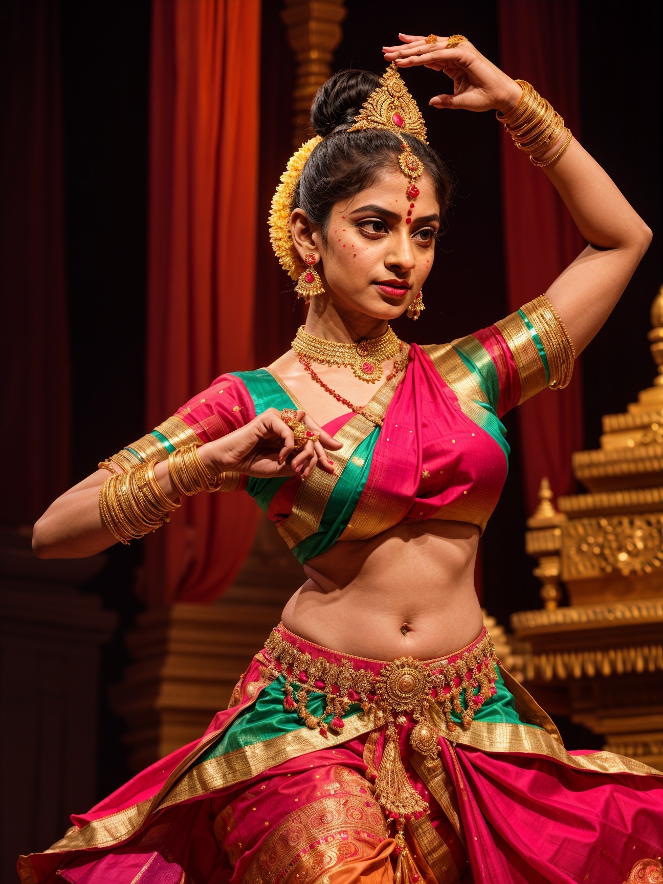 Prompt: "Graceful Bharatanatyam performance, intricate hand gestures, expressive facial expressions, traditional Hindu costume with vibrant colors, intricate jewelry, stage presence, elegant dance movements, intricate footwork, traditional makeup, classical Indian dance form, iconic Rukmini Devi Arundale portrayal, captivating theater lighting, shadows and highlights, dramatic ambiance, cultural significance, artistic representation, stage setting, dynamic poses, storytelling through dance, mesmerizing performance."