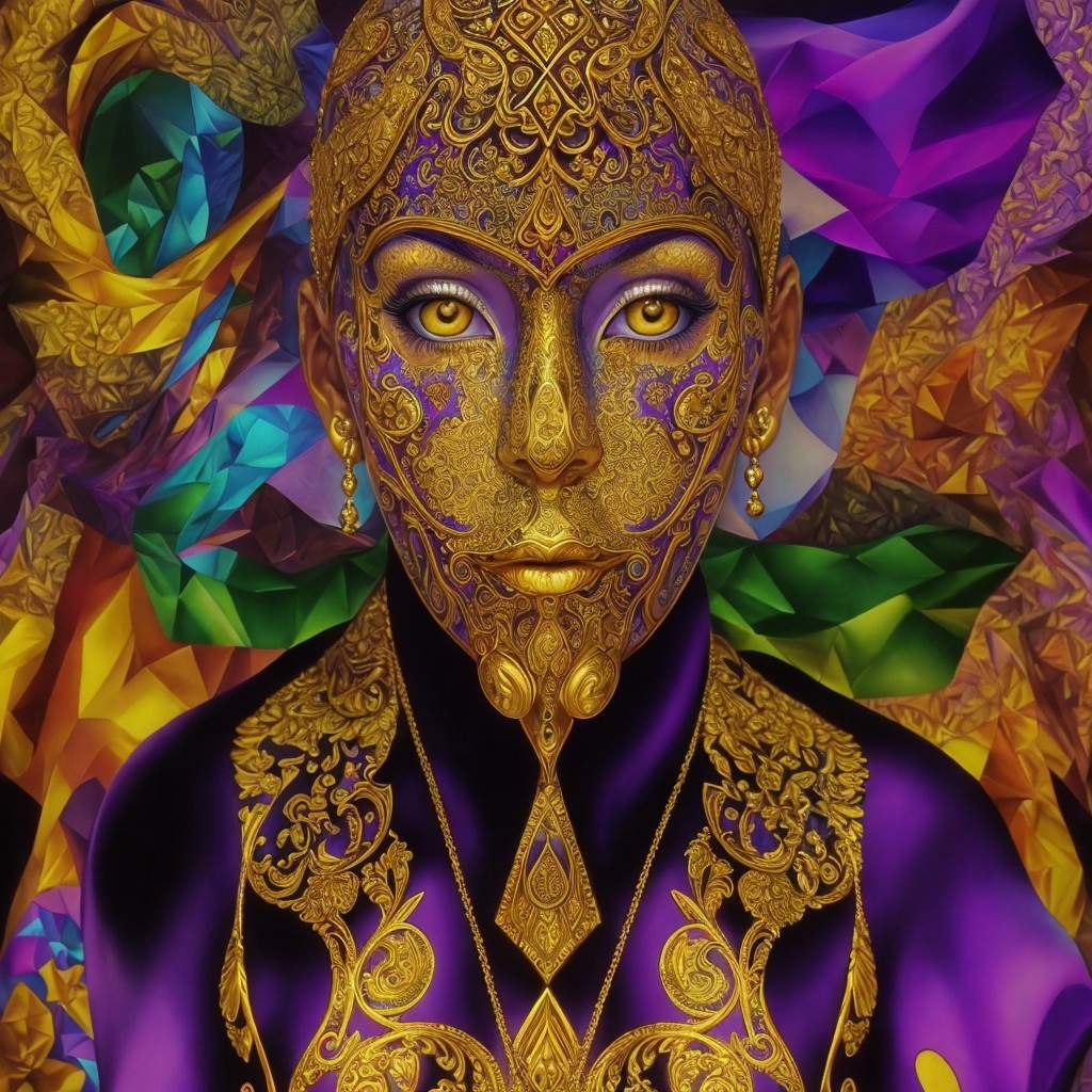 A striking portrait of a woman adorned with intricate golden patterns against a vibrant, colorful background. The blend of colors and details creates a mesmerizing, mystical aura.