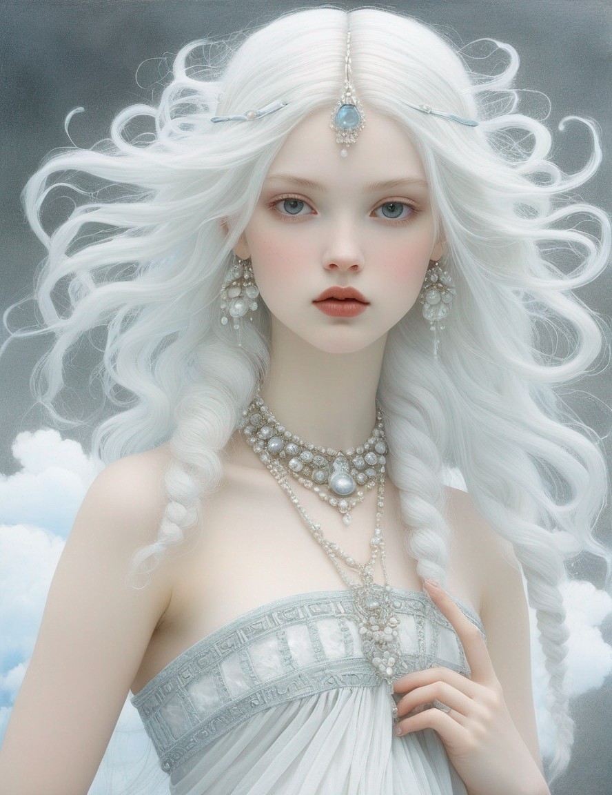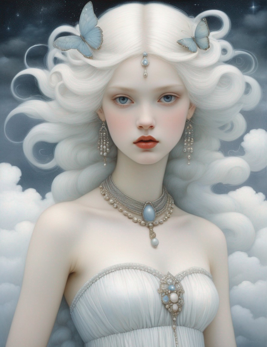 Pale woman with cloud hairdo and pearls in surreal portrait