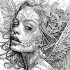 A striking portrait features a woman with intricate body art and bold, swirling patterns. Her piercing blue eyes contrast with the monochrome design, accented by floral motifs and a mythical creature.