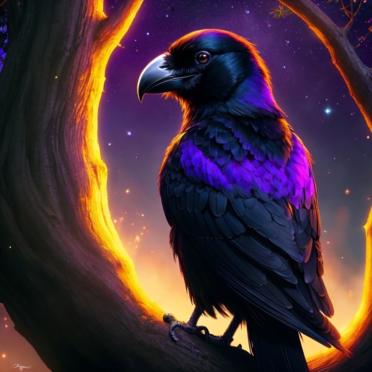 A majestic raven with iridescent feathers perched on a branch against a backdrop of a starry twilight sky and glowing tree silhouettes.