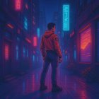 A colorful oil painting of a young man, viewed from behind, standing in a busy Asian street market at night, illuminated by the bright street lights and illuminated signs with Japanese characters. He is wearing a bright orange hooded sweatshirt, dark blue jeans, and brown shoes. His hands are in his pockets,