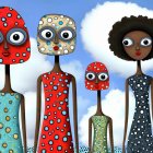 The image features four elegant mannequins with striking hairstyles and bold makeup, dressed in stylish polka dot dresses. The backdrop showcases a bright, cloud-filled sky.