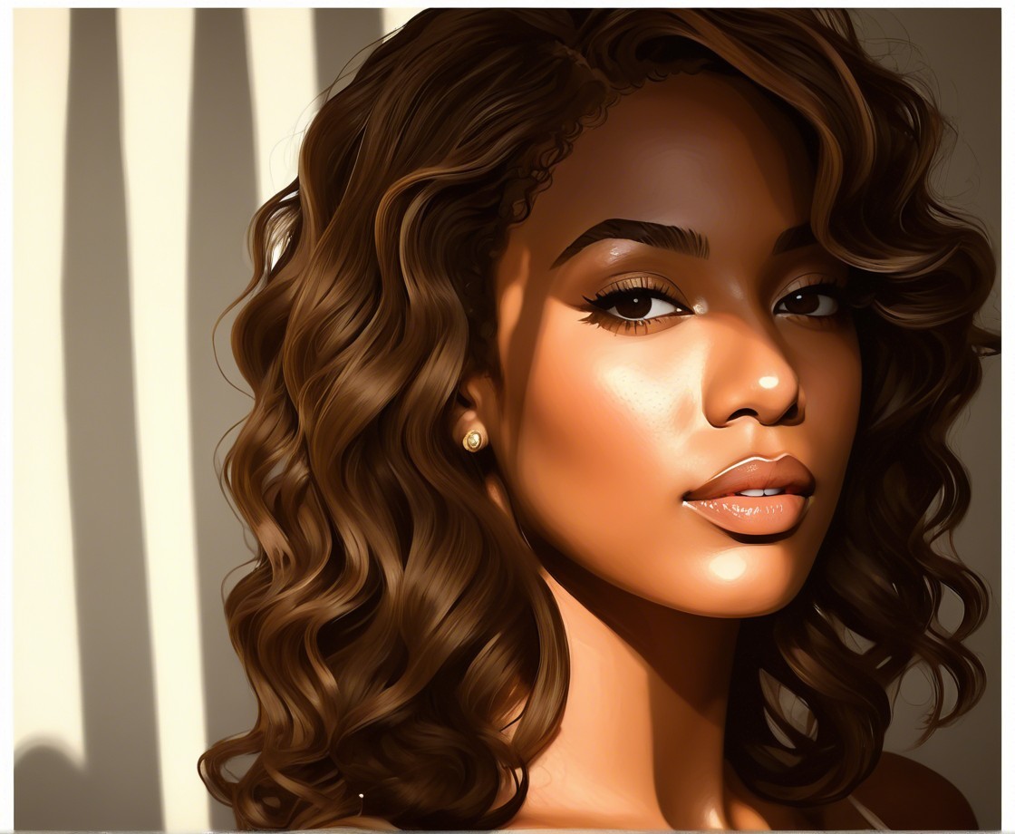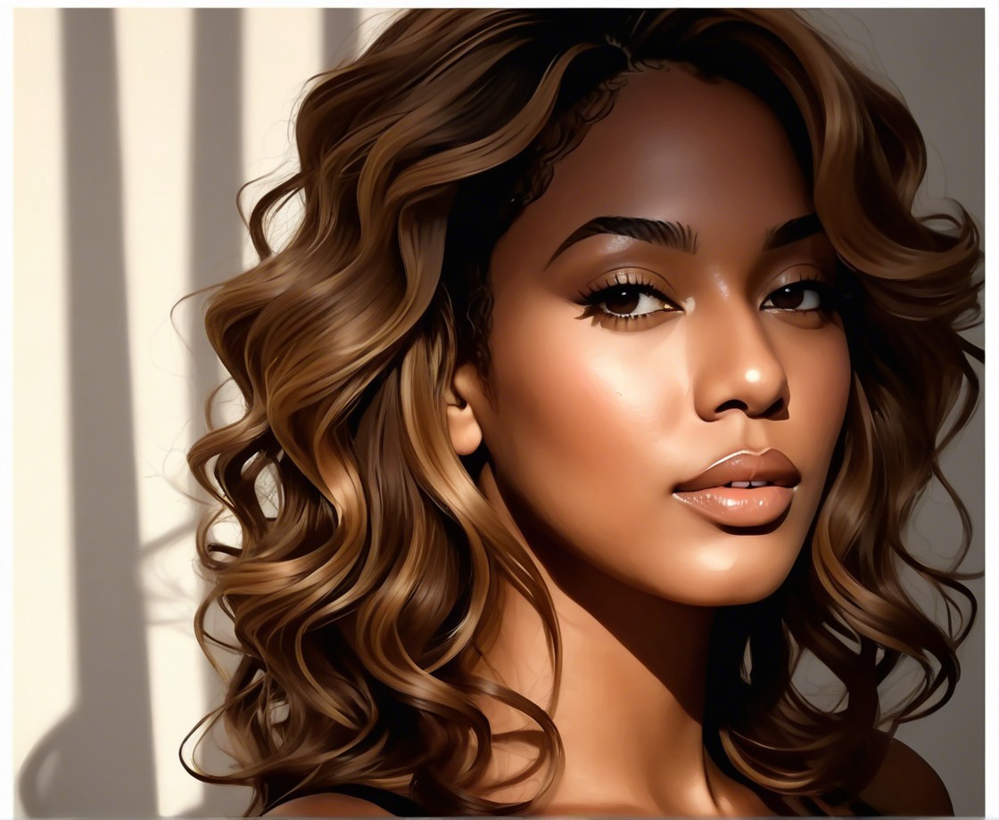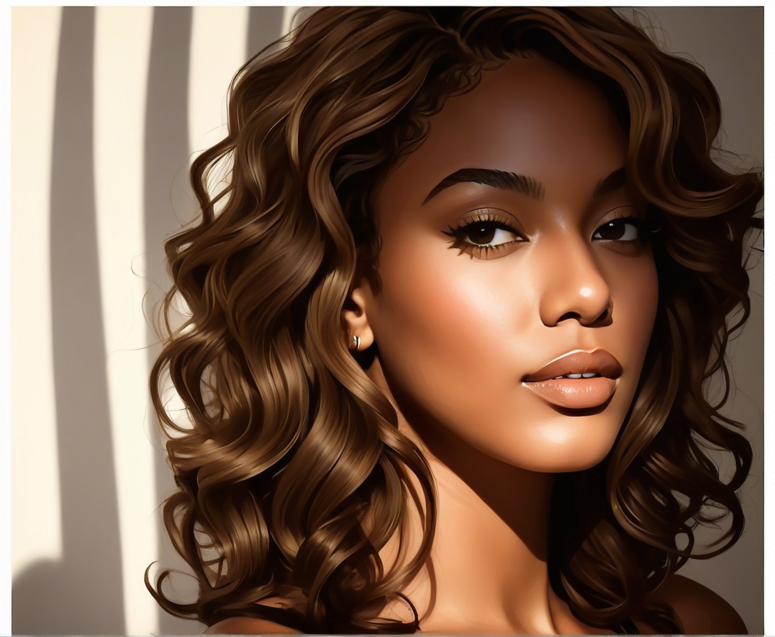 The image features a portrait of a woman with wavy, shoulder-length hair. Her warm complexion glows in soft light, highlighting her elegant features and confident expression.