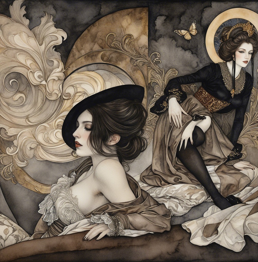 A beautifully rendered portrait of a woman in delicate, flowing fabrics, reclining gracefully with a serene expression. Her long hair and subtle makeup enhance the elegance of the scene.