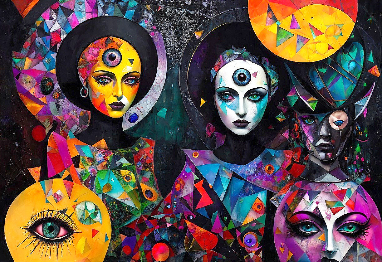 The artwork features two stylized figures with striking colors, geometric shapes, and celestial motifs. Their intense expressions and vibrant patterns create a mystical and captivating atmosphere.