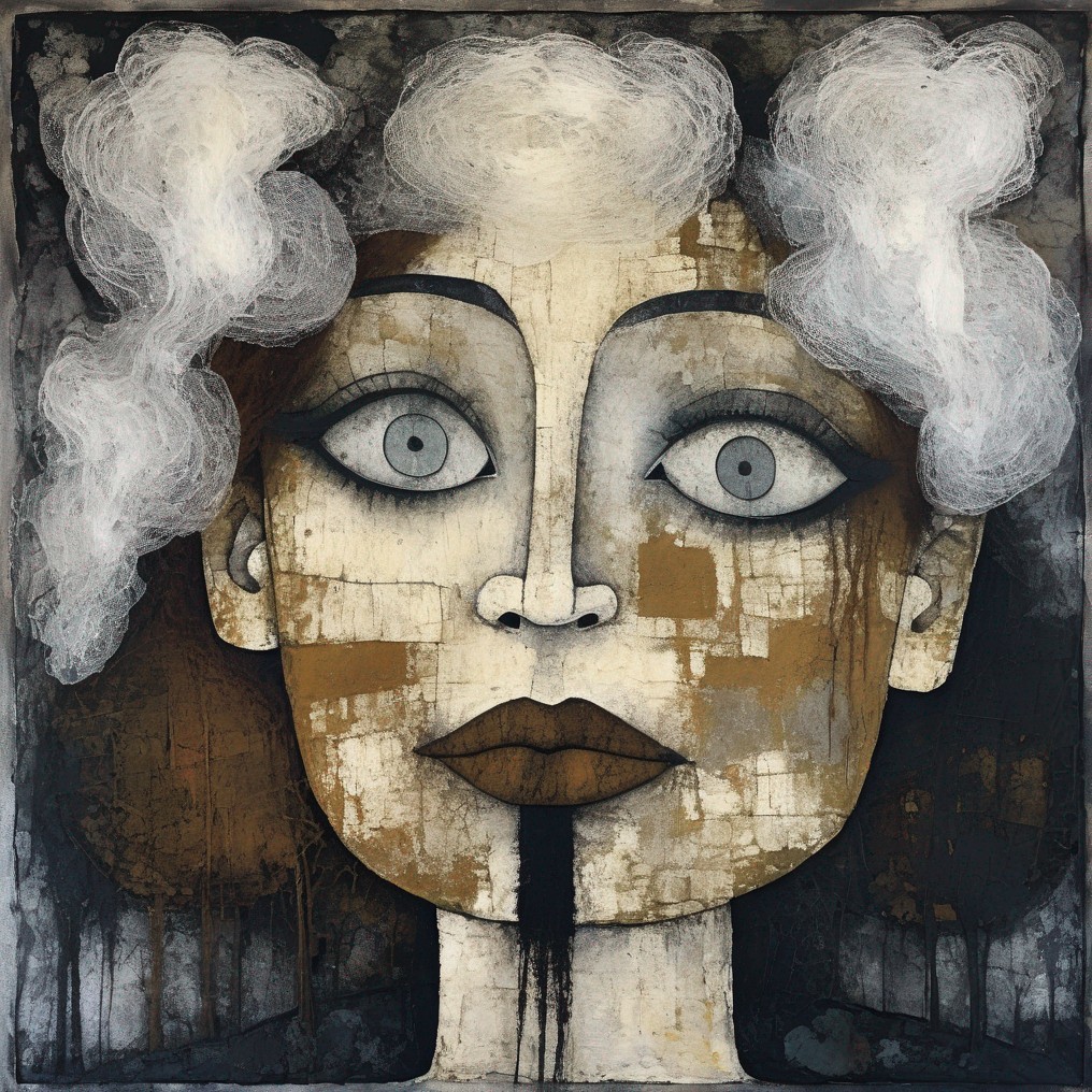 A stylized painting of a symmetrical, monochromatic face with golden patches and a textured, cracked background.
