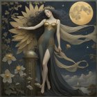 A mysterious woman in a dark, elegant gown stands gracefully under a full moon. Her flowing hair and veil complement the enchanting night sky, creating a captivating, ethereal atmosphere.
