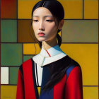 A young girl with long hair reads intently from a colorful book, set against a vibrant, geometric background of bold squares and rectangles, blending hues of red, blue, yellow, and green.