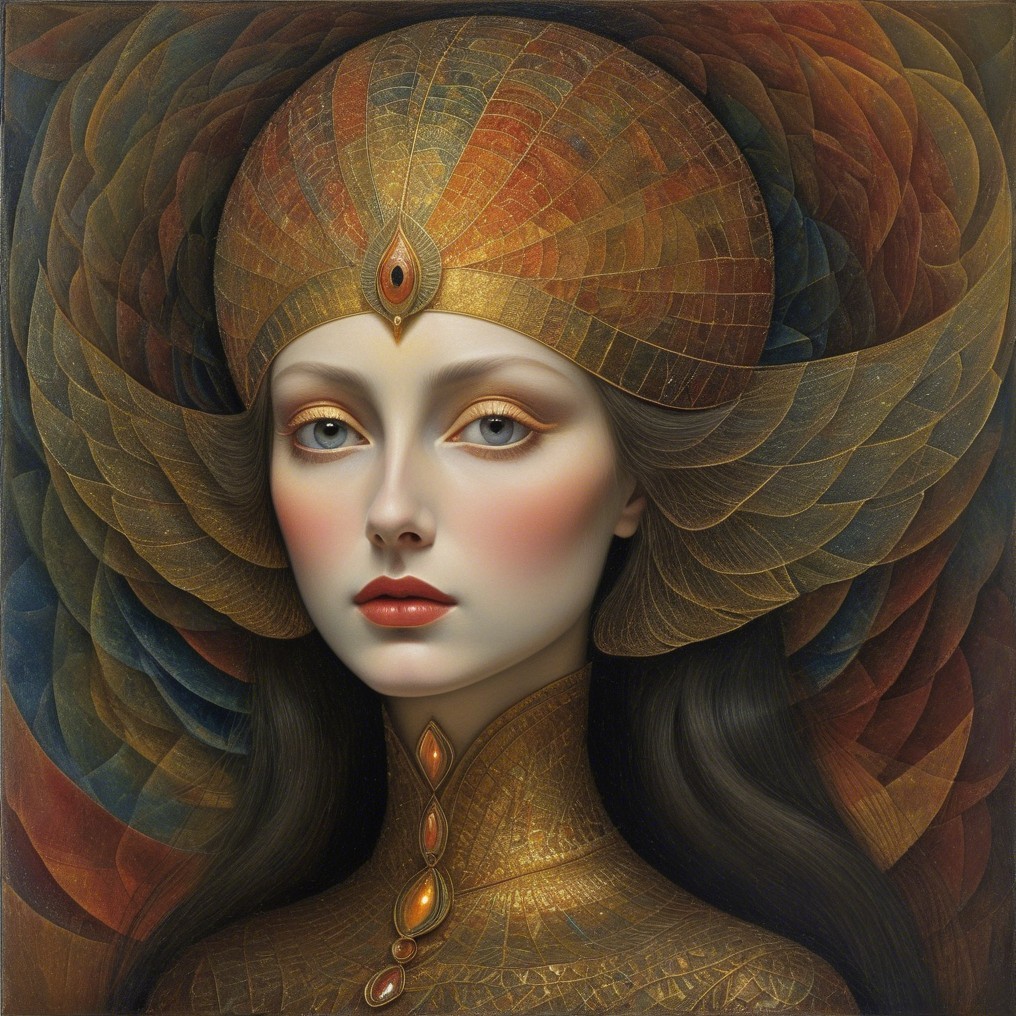 A single image, psychedelic siren, style of Alex Grey, style of Remedios Varo, style of Paul Klee, style of Leonora Carrington, eye contact, soft, beautiful delicate interplay of light and shadows on every surface, exotic, vivid, radiant, kaleidoscopic, highly colorful, most complex and highly intricate, dominant golden and rouge colors, highly intricate and utterly complex designs and patterns, exciting.