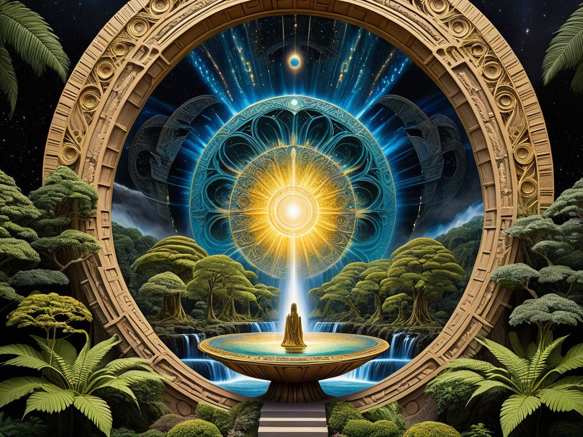 A mystical scene featuring a glowing sun at the center of a cosmic portal, surrounded by lush trees and serene water, with a meditating figure set against a vibrant starry backdrop.