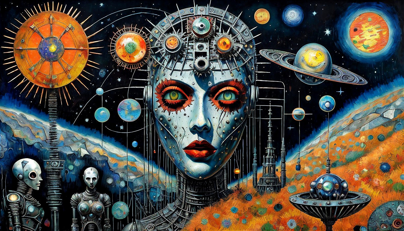 + Prompt:mixed media modern art. Floating giant witches metal head in the sky. horror inspired. rusted robots. Van Gogh fine art Marc Chagall, Amedeo Modigliani, Enki Bilal, Horror themed, Stephen Gammell ,Rosina Wachtmeister cosmic astronomy photo background. Inspired by Aliens, Hellraiser, Androids and cyberpunk. intricate photorealistic high detail colourful , by Tim Burton, Ed Repka and Gustav Klimt