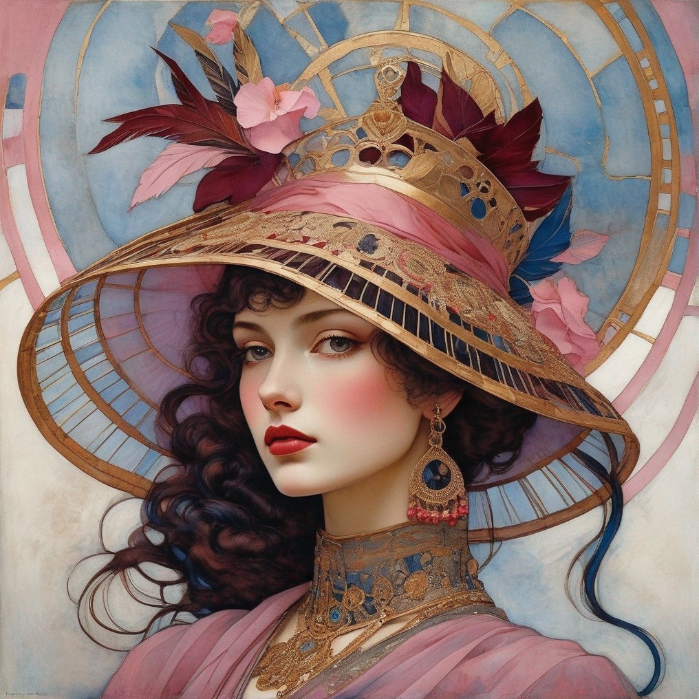whimsical, beautiful, poignant, touching. colors pink, gold, rust, indigo, burgundy, black. soft watercolor extra water in Art Deco by Annigoni, Egon Schiele, Milo Manara, Botticelli, Catrin Welz-Stein, Jean Metzinger, Klimt, perfect eyes, perfect hands face , highly detailed, complementary colors, hyper detailed. Watercolor and ink splatter, dynamic pose,