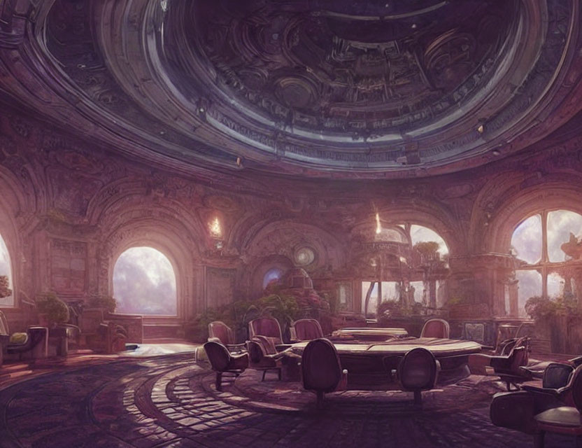 Futuristic fractal interior with round table, round seats, round cabinets, concept art with 16D resolution, high definition, photorealistic, Thomas Kincaid & Ferdinand Knab, dynamic lighting, bright studio setting