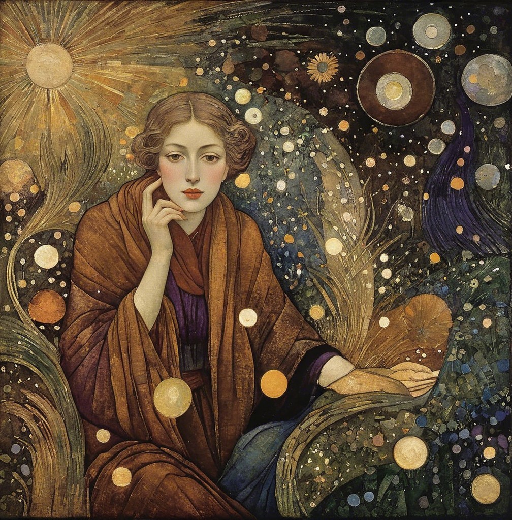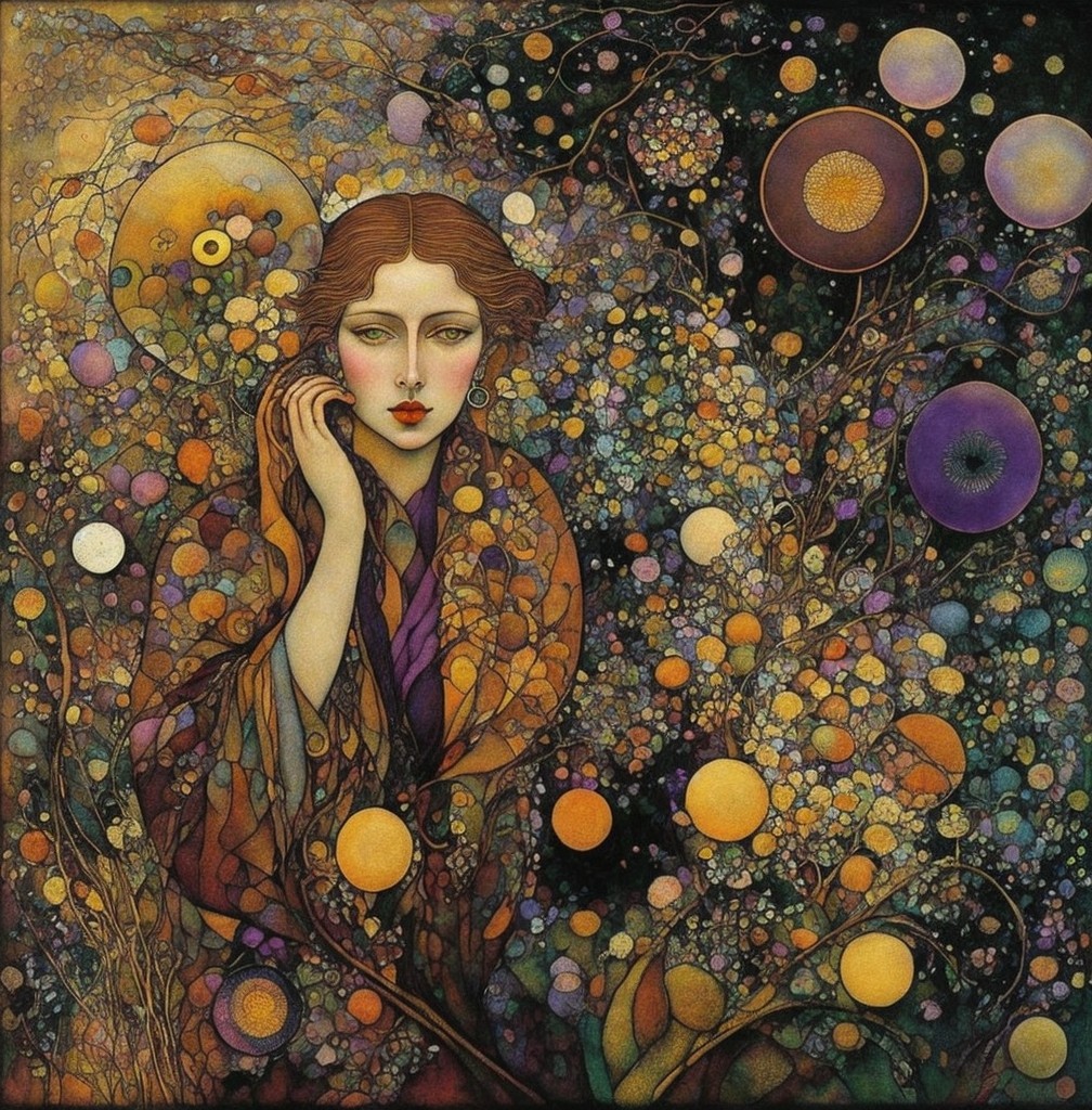This captivating artwork features a woman with striking features, adorned in colorful patterns. Surrounding her are abstract circles and soft backgrounds, blending nature and emotion harmoniously.