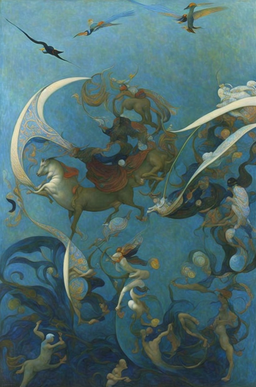 The image features ethereal figures entwined in vibrant underwater scenes, surrounded by swirling patterns, fish, and aquatic life, all set against a rich blue backdrop of swirling flora.