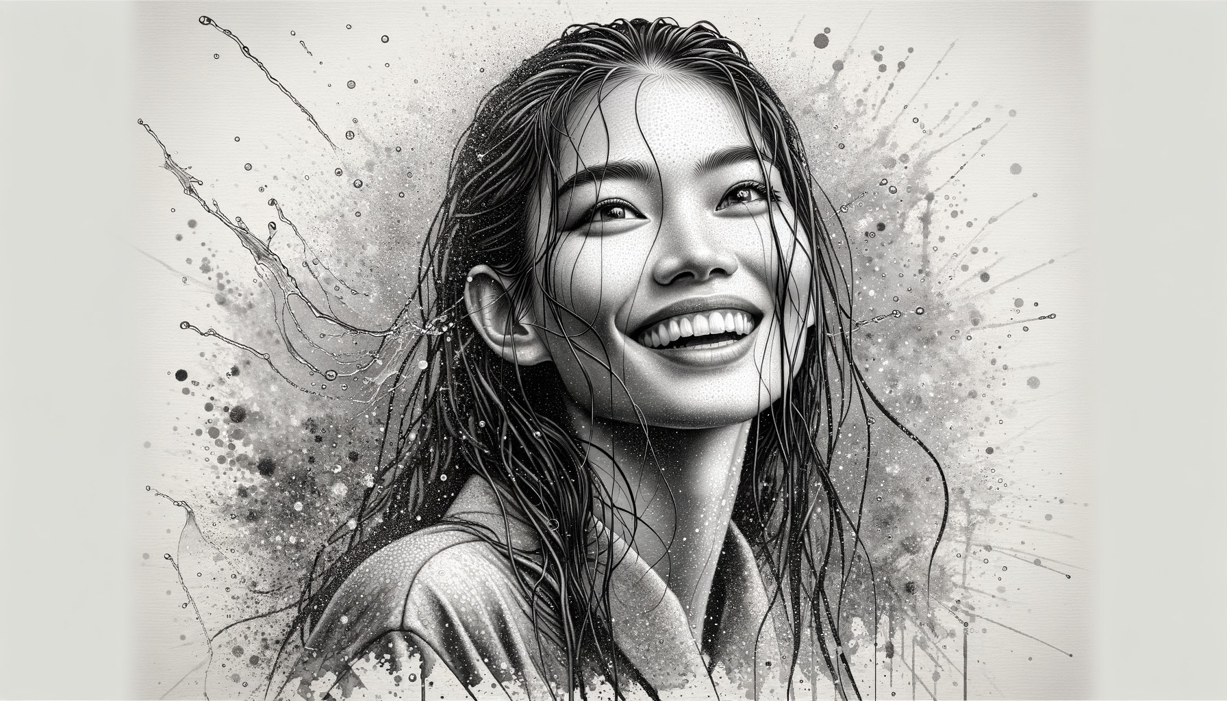 with water cascading down her hair and glistening on her skin, She has a wide, radiant smile, exuding happiness and freedom. Photorealistic , Hyperdetail, UHD, semi translucent watercolor pastel hues on the backgroud hue, black and white, highly detailed textures hair and water drops, intricate masterpiece uniqu dynamic pose sophisticated , high resolution ,16K high definition, sharp focus close up,sophisticated elegant delicate, high precission high quallity , extremly clean and sharp precission detailed outlines, hyper detailed sketch technique, highly structured, hyper sharp close up"