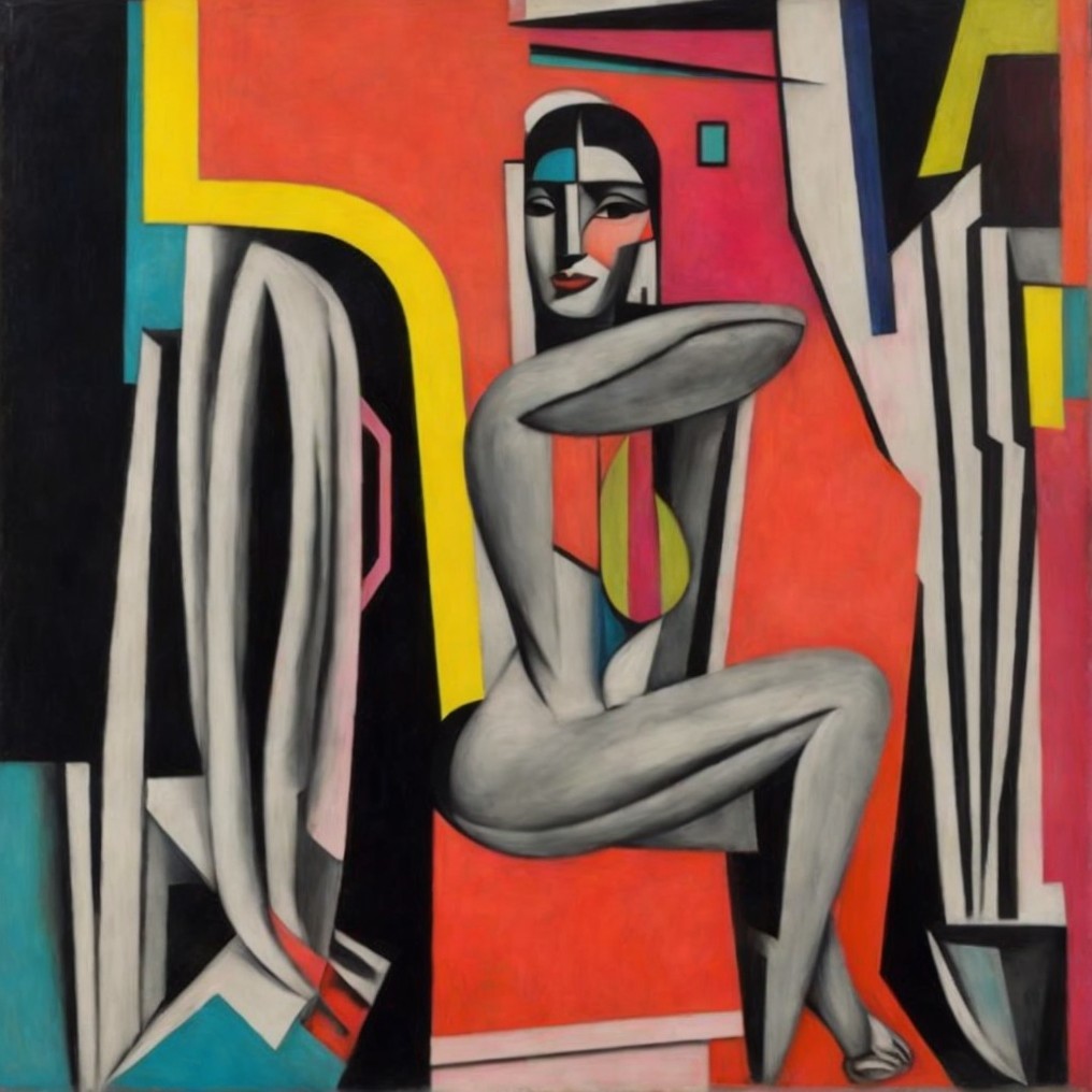 Artistic Statement: The work fuses Cubism’s fractured geometry with Art Deco’s stylized elegance. Bold color blocks frame a sculptural figure, balancing intimacy and theatricality. Inspired by early 20th-century explorations of form, the piece reimagines the dressing room as a stage of modern identity.