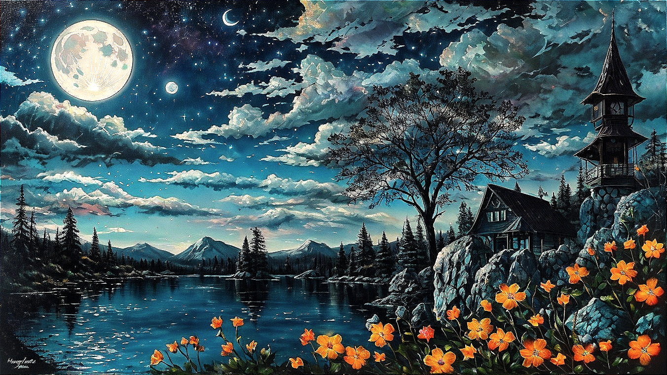 A serene night landscape features a full moon illuminating a tranquil lake surrounded by mountains and dense forests. Vibrant orange flowers bloom in the foreground, adding a splash of color.