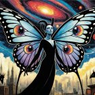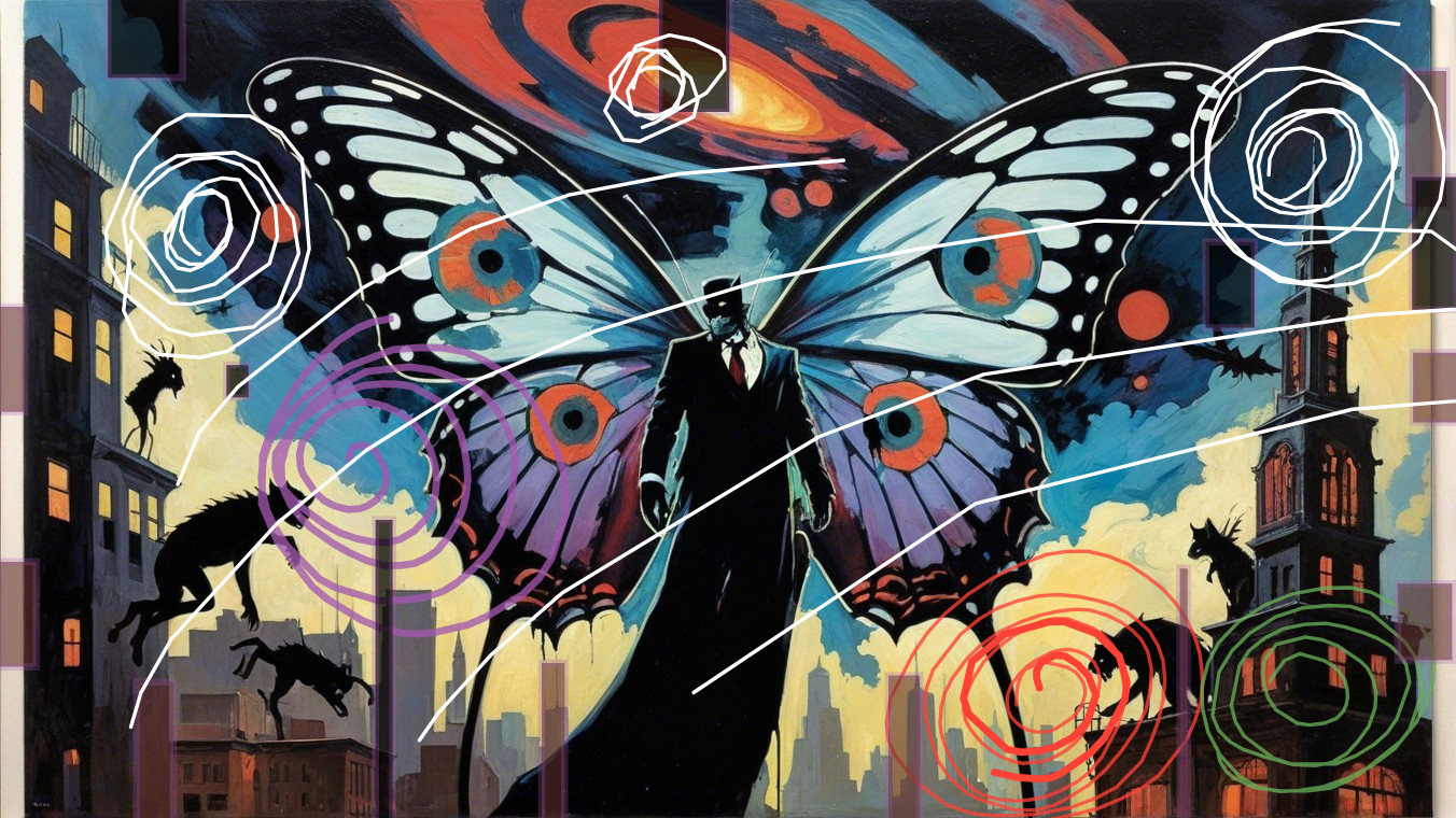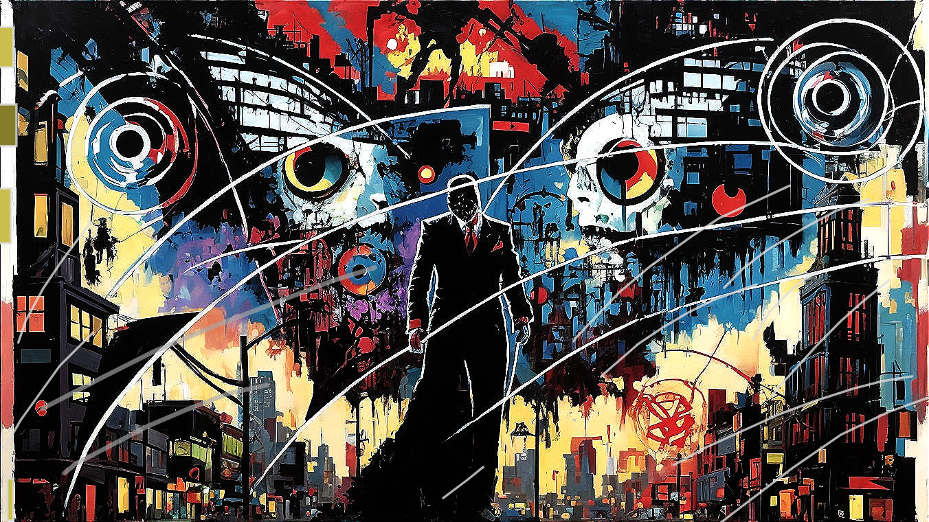 A striking, colorful artwork featuring a mysterious figure in a suit against a backdrop of vivid urban scenes, skulls, and bold abstract patterns that convey a sense of intrigue and drama.