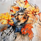 A serene woman with long, flowing hair stands amid vibrant blue flowers. She wears a yellow dress, set against a warm, golden background, evoking a dreamlike, ethereal atmosphere.