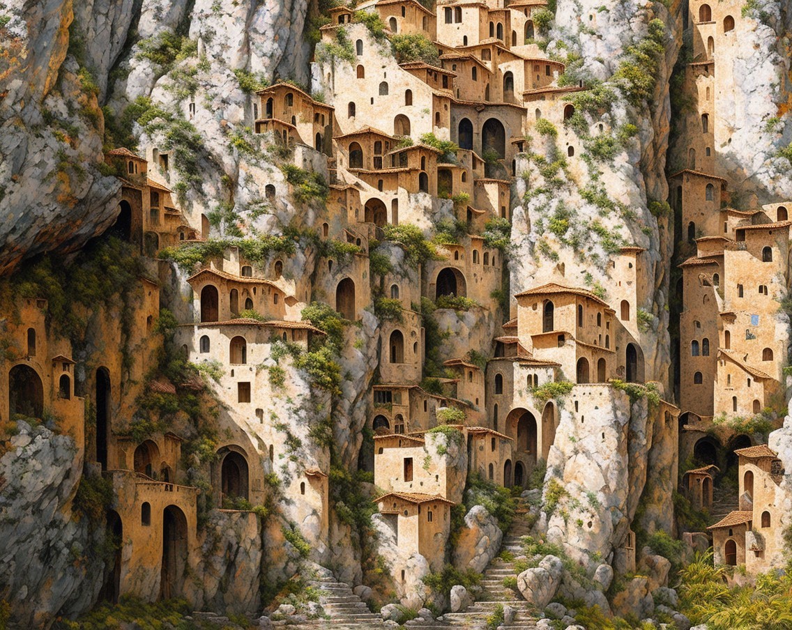 + Prompt:Style by Paul Bril. The monastery in the rock walls.many small houses, huge statue, columns and arcades, colored roofs, monks, rivulets, marble