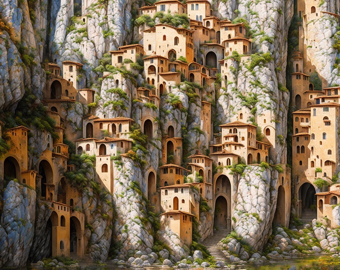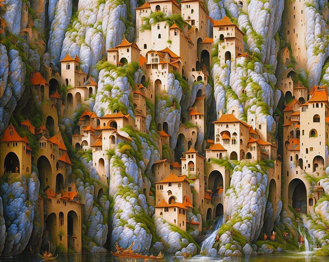 Prompt: Style by Hieronymus Bosch. Monk in front of a rock monastery with arcades and many houses in the steep, high rock face, artfully patterned marble and gently bubbling stream