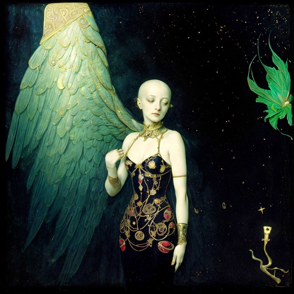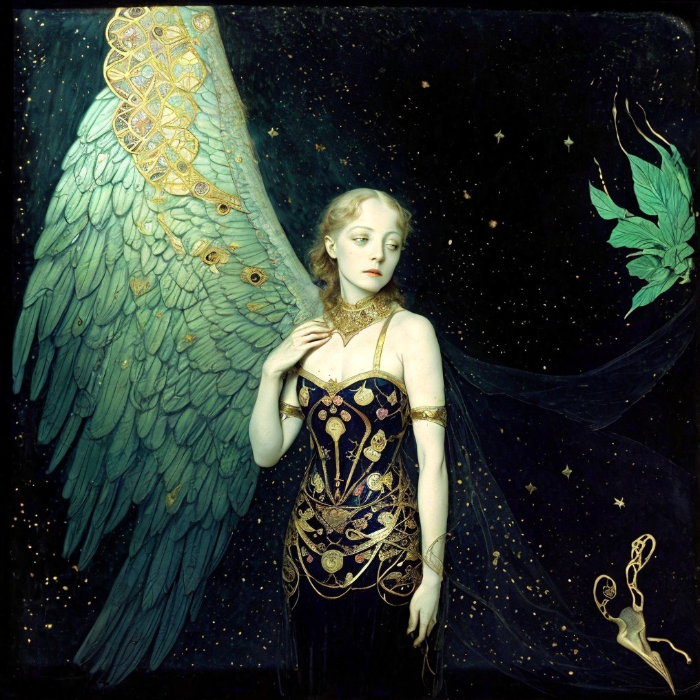 A stylized painting depicts a winged woman with golden accents, set against a starry, dark blue background with a floating red orb.