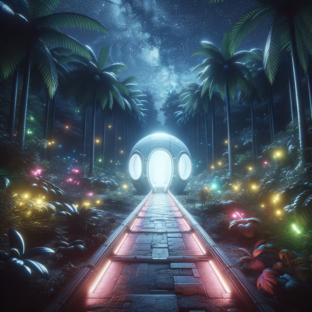 Prompt: "Dark contrast in an Oppressive and eerie Photography of an futuristic white glowing capsule, old jungle pathway, starry night cloudy, dark adventures in a surreal jungle island with tropical beach, highly detailed illustration by Jeremy Mann, Alex Maleev, Pino Daeni and Liz Gael, masterpiece, 8k resolution, trending on artstation, rough texture, sharp focus, highly detailed intricate, masterpiece, best quality, official art, extremely detailed CG unity 8k wallpaper, highly detailed, absurdres,"