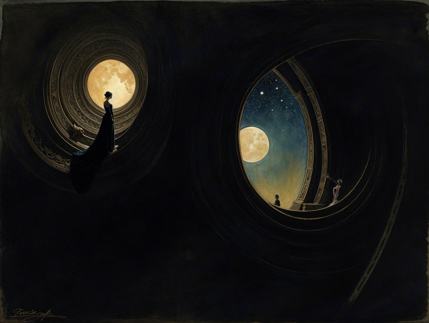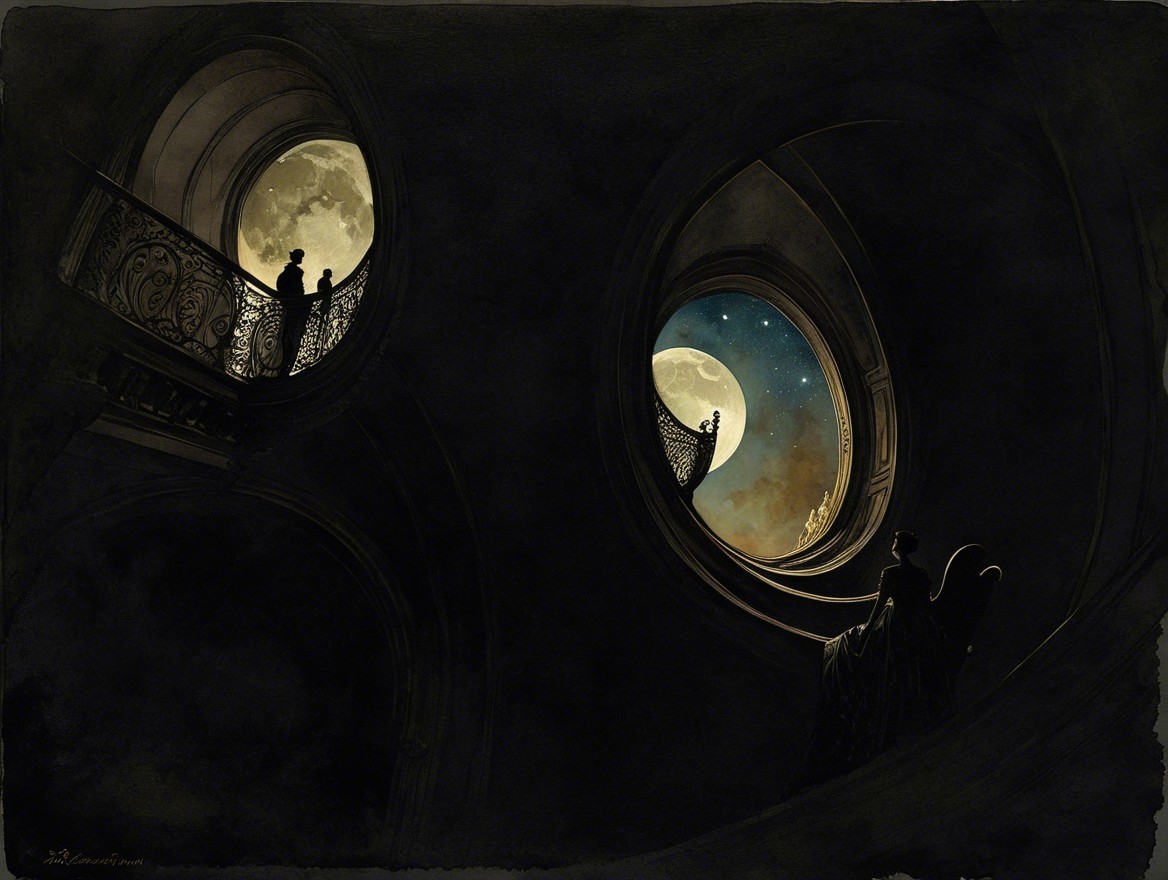 A dark, atmospheric scene shows two women in elegant dresses. One gazes out a large window at celestial bodies, while the other stands in shadow, creating a sense of mystery and wonder.