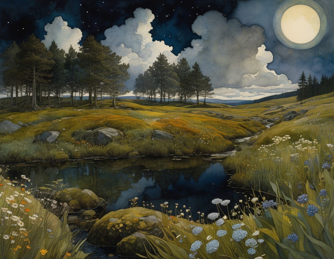 A serene landscape features rolling hills, a gentle stream, and a bright moon illuminating the night sky, with lush greenery and wildflowers adding vibrant colors to the tranquil scene.