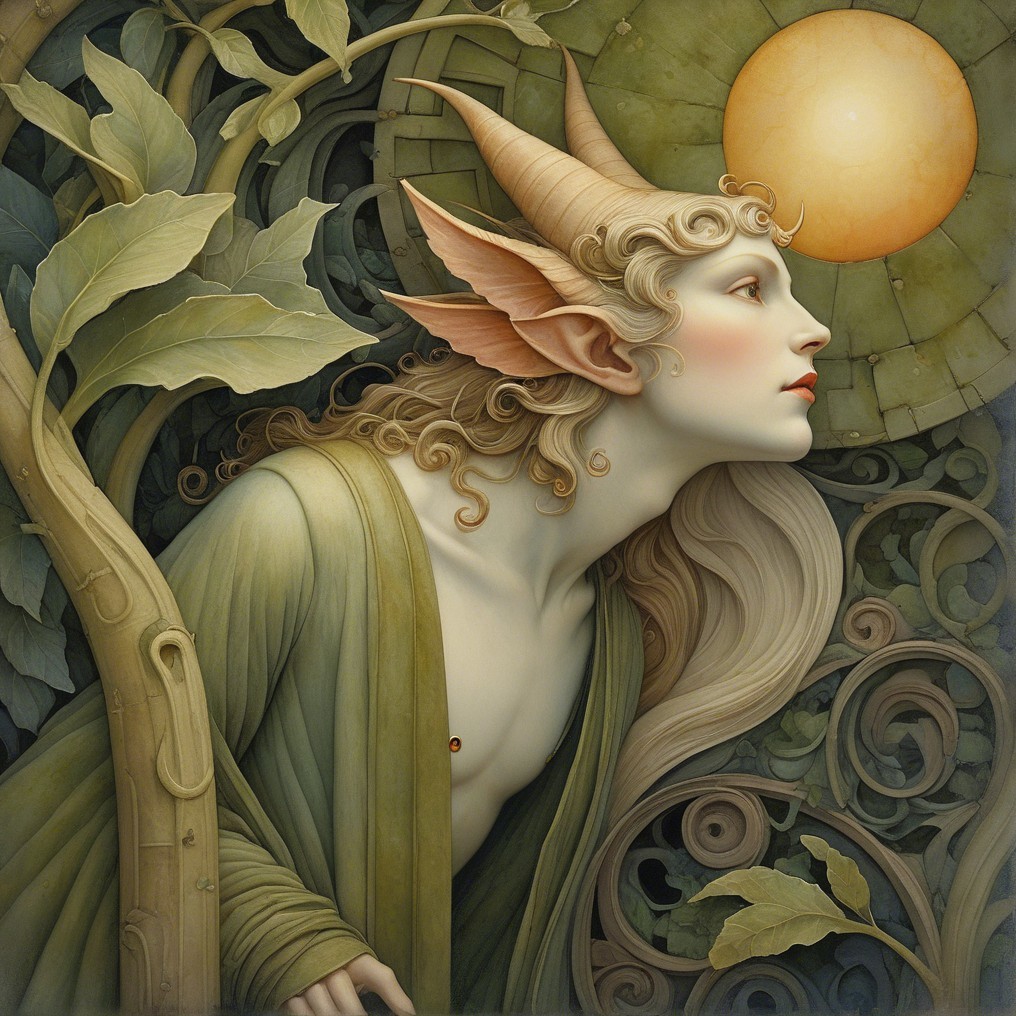 Close up, impish devilish creature with a staring in a portal in a garden maze, in the style of Alexander Jansson. by Catrin Welz-Stein, Michael Parkes. By Rob Gonsalves, Markus Pierson
