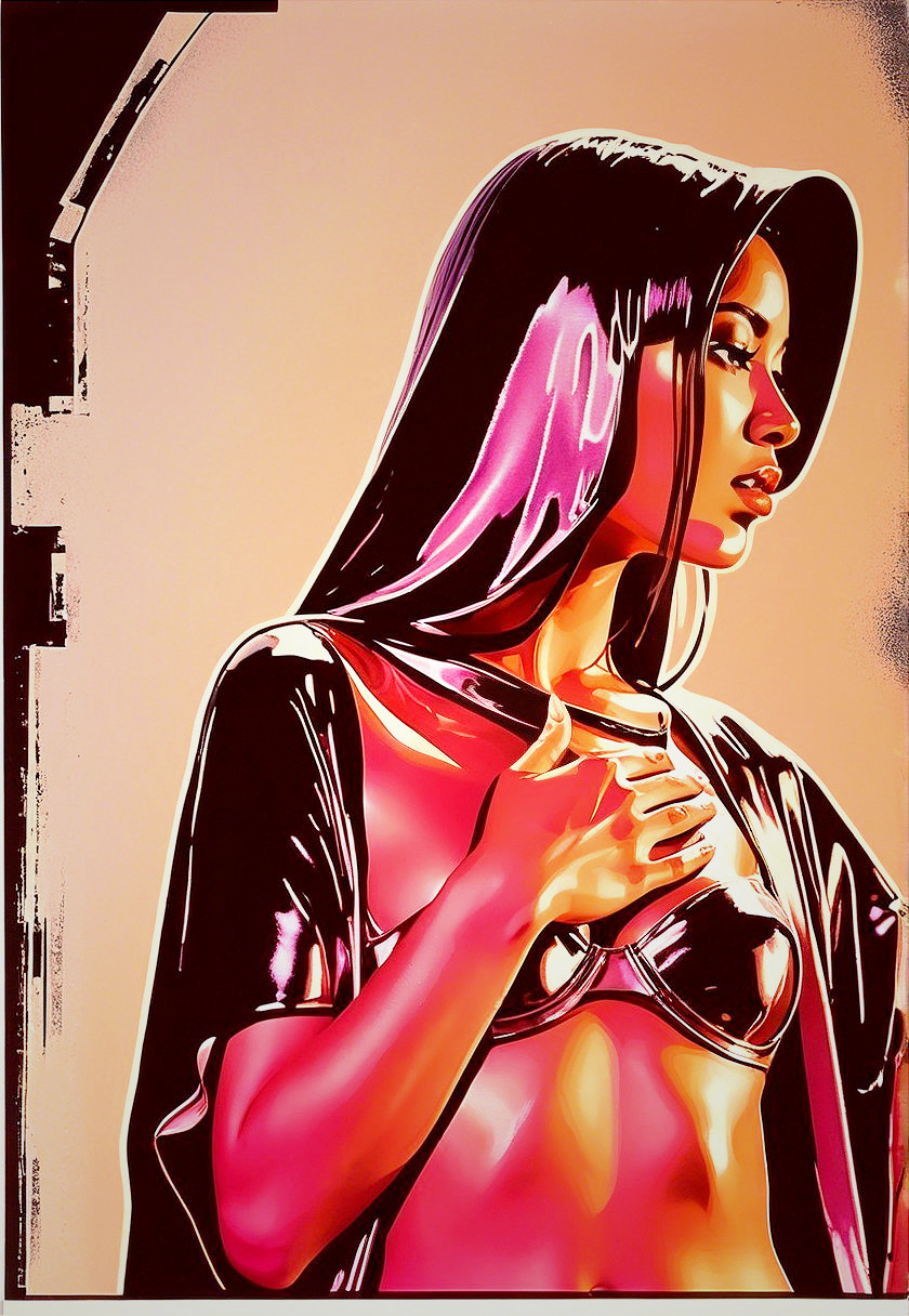 The image features a woman in a glossy, metallic hooded outfit. She gazes thoughtfully to the side, with soft lighting accentuating her features and the sleek texture of her attire.