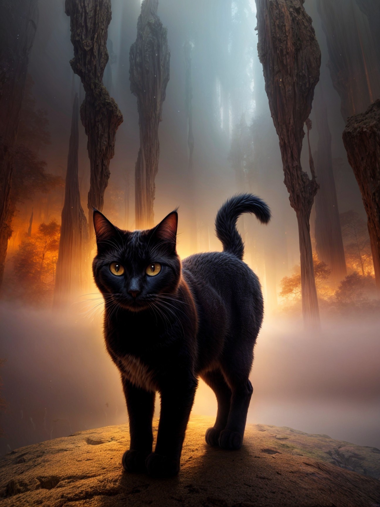 A sleek black cat stands on a rocky surface, illuminated by a warm, ethereal glow. Majestic pillars rise in the misty background, creating a mystical and enchanting atmosphere.