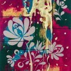 A painting featuring bold flowers in shades of white, red, and pink, set against an abstract background of colorful geometric shapes...
