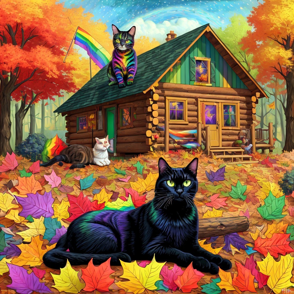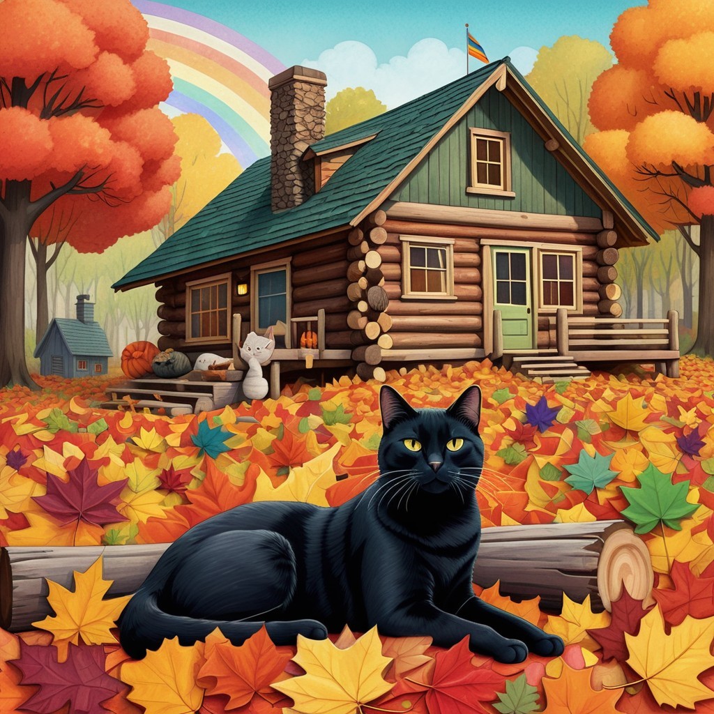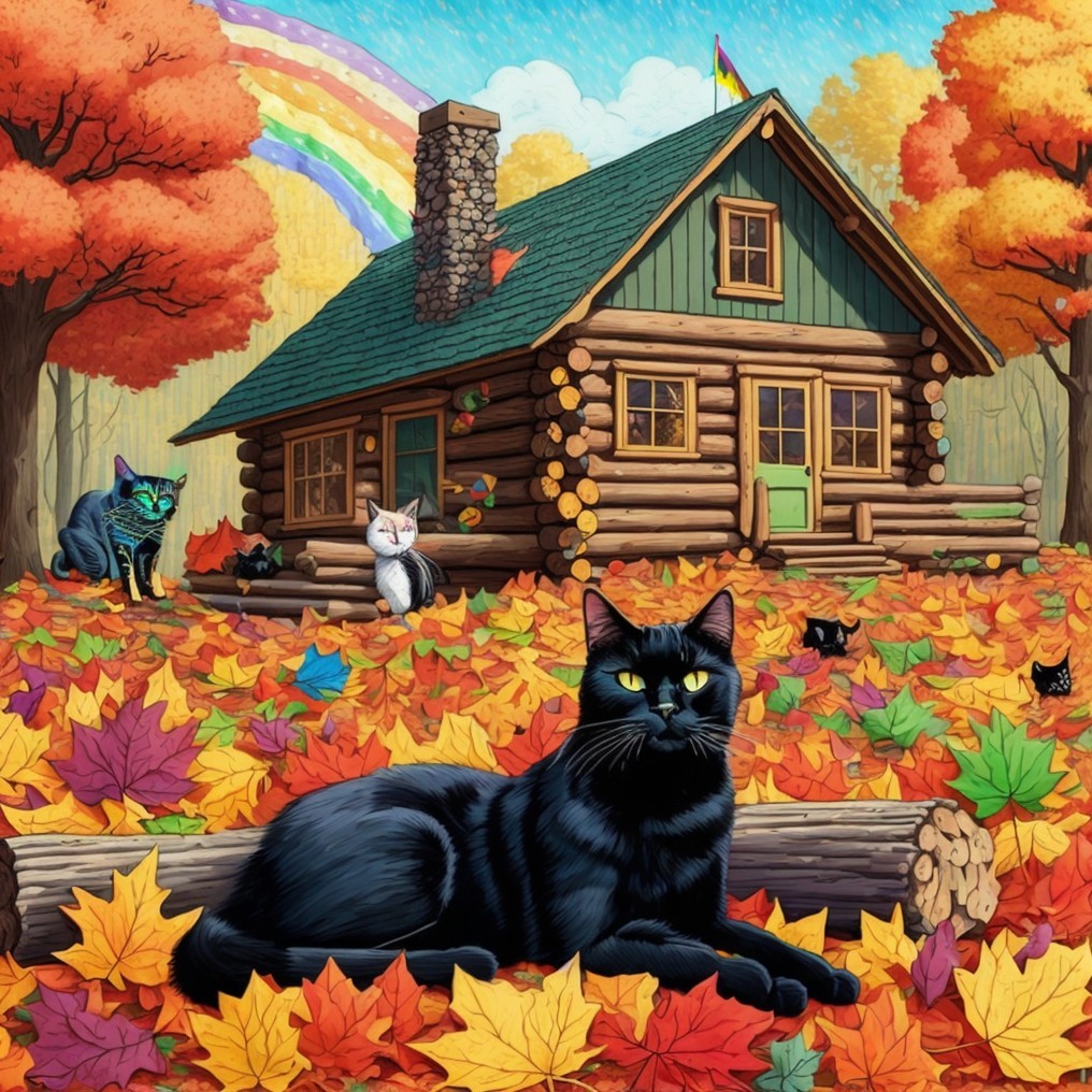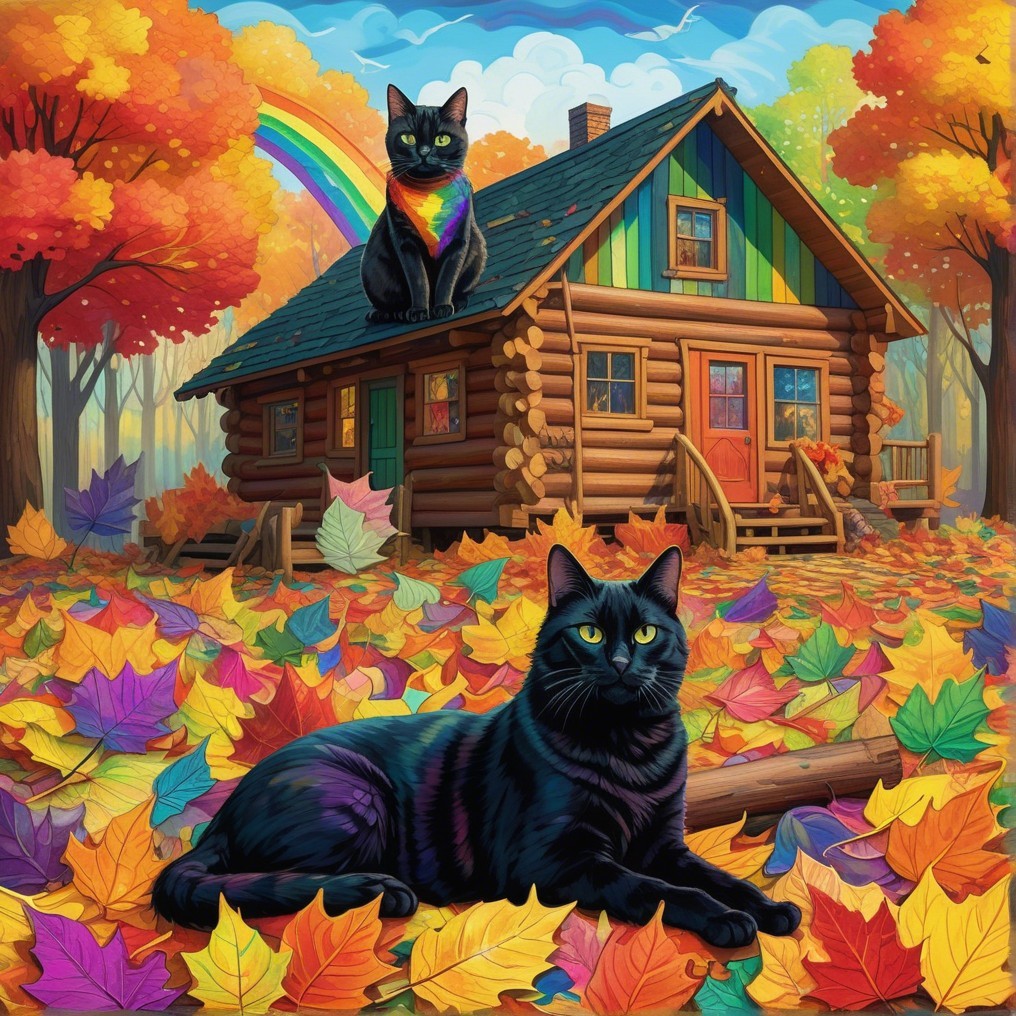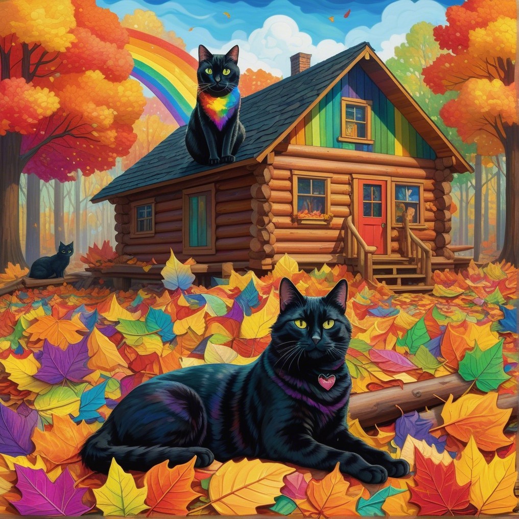 A vibrant autumn scene features a cozy log cabin adorned with rainbow colors, surrounded by colorful fall leaves. Three black cats grace the foreground, adding charm to this whimsical landscape.