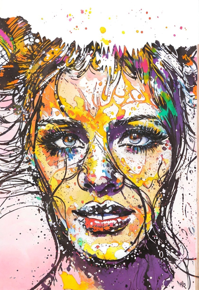 Portraiture of teenage temptress drawn with pencil and ballpen, splashing, headshot, blotting quill pen, style of Overton Loyd merged with70ies adult franco-belgian comic art style, ballsy strokes, fine encoustic streaks, squiggly lines, fiery.colored with softened aquarelle, stylized, overspray of color, stylized comic book art by Gerald Scarfe and Georgia O'Keeffe, Hues, brightness 1.9, serene, frankly, fauvistic, layered geometrical vector art, Figurative, back-lit, delicate coloring, abstract, intricate, epic, fuzzy, twirly, gorgeous, beautiful composition, synthetic, heretic, sumptuous, intricate fine lineage, filigrane texture of fine lines, quilling, quaint, instaport style, cel-shaded, golden ratio, high coloring, brushed textures 1.7, 3d effects 1.8, ambient occlusion 1.5, anisotropic filtering 1.3, raytraced shadows 1.8, sublime, brightness 1.4, tetradic color scheme blue pink lilac emerald, stacked-up perspective 1.9, gouache details, geometrical features, octane render illustration, dreamscape, beautiful composition 1.9, plasticity 1.6,