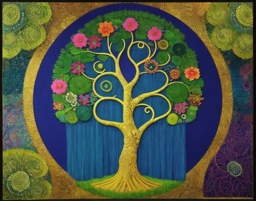 Prompt: 3d acrylic Patchwork, hardy Tingatinga Tree of Life, lacy ferns, delicate saturated multi-colored tropical flowers, with elements in the style of Gustav Klimt, by Enki Bilal