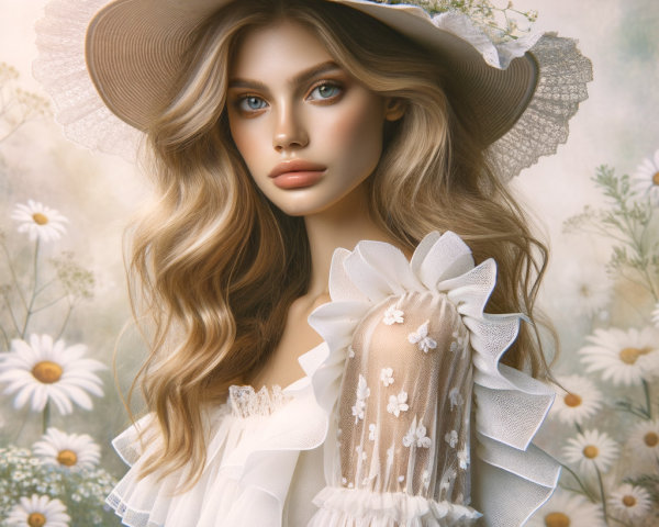 A young woman with long, flowing curly hair adorned with a floral crown of pink and white roses. She wears a soft, off-shoulder peach blouse, exuding a gentle and serene beauty.