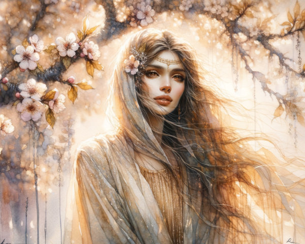 A beautiful woman with flowing red curls and a serene expression gazes softly. She wears a shimmering blue-green dress adorned with jewels, set against a mystical, starry background.