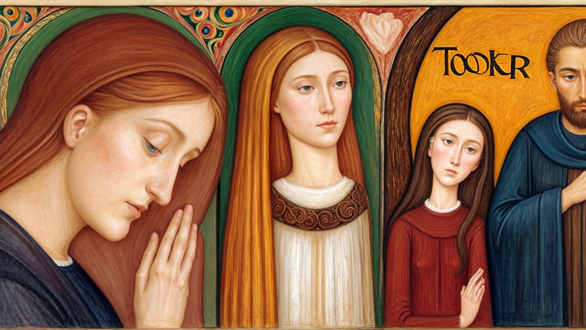 The image features five ethereal young women with varying hair colors and styles, each displaying serene expressions. Their intricate outfits and soft backgrounds create a harmonious, artistic composition. Note: This reminds me that last Sunday I happened to show up at mass on the first communion day when there were lots of little girls in white. I happened to be surrounded with teenage girls who were not getting their first communion, although they all took the host. If you are a Baptist reading this just ignore the details. George Tooker did not paint girls lined up like this. People lined up is an old Lakota or Cheyanne drawing system. Oddly enough, I happened to teach at a Lakota school for a while and I once gave paper and colored pencils to a girl who drew a picture of her friends all lined up in a row, just like in the old ledger books. Even more oddly, Tooker used to draw pictures and painting ideas in a ledger book.