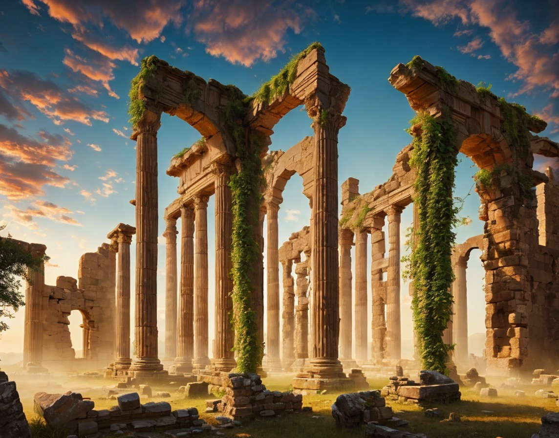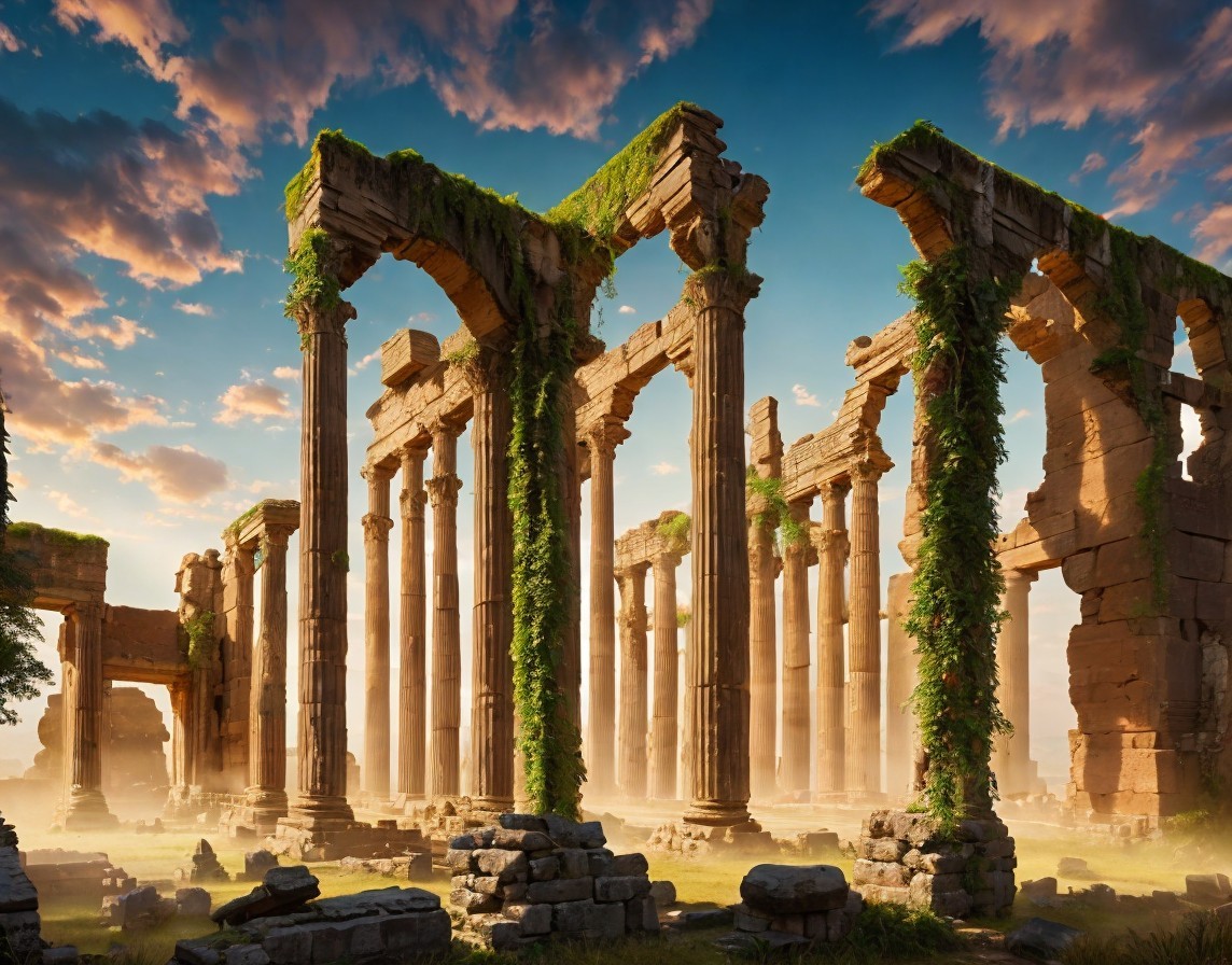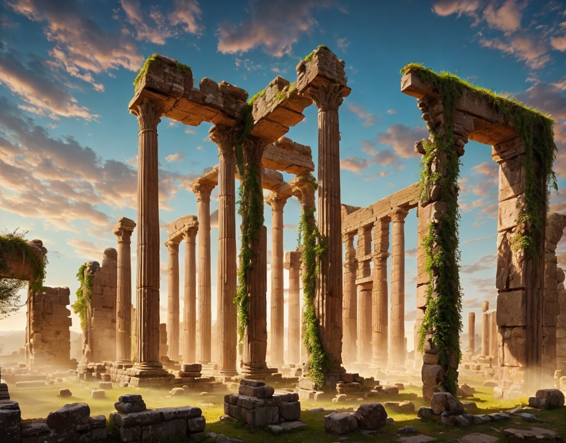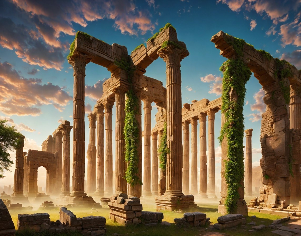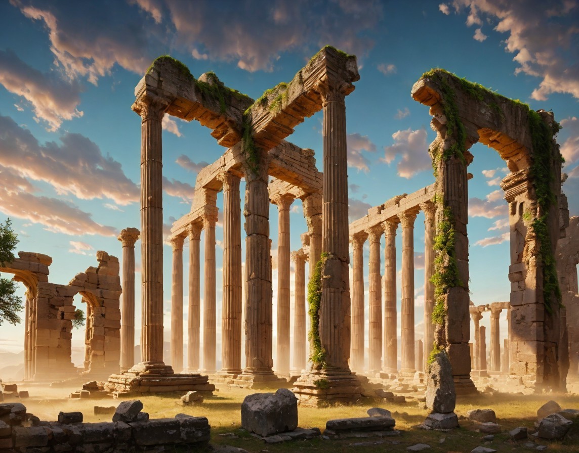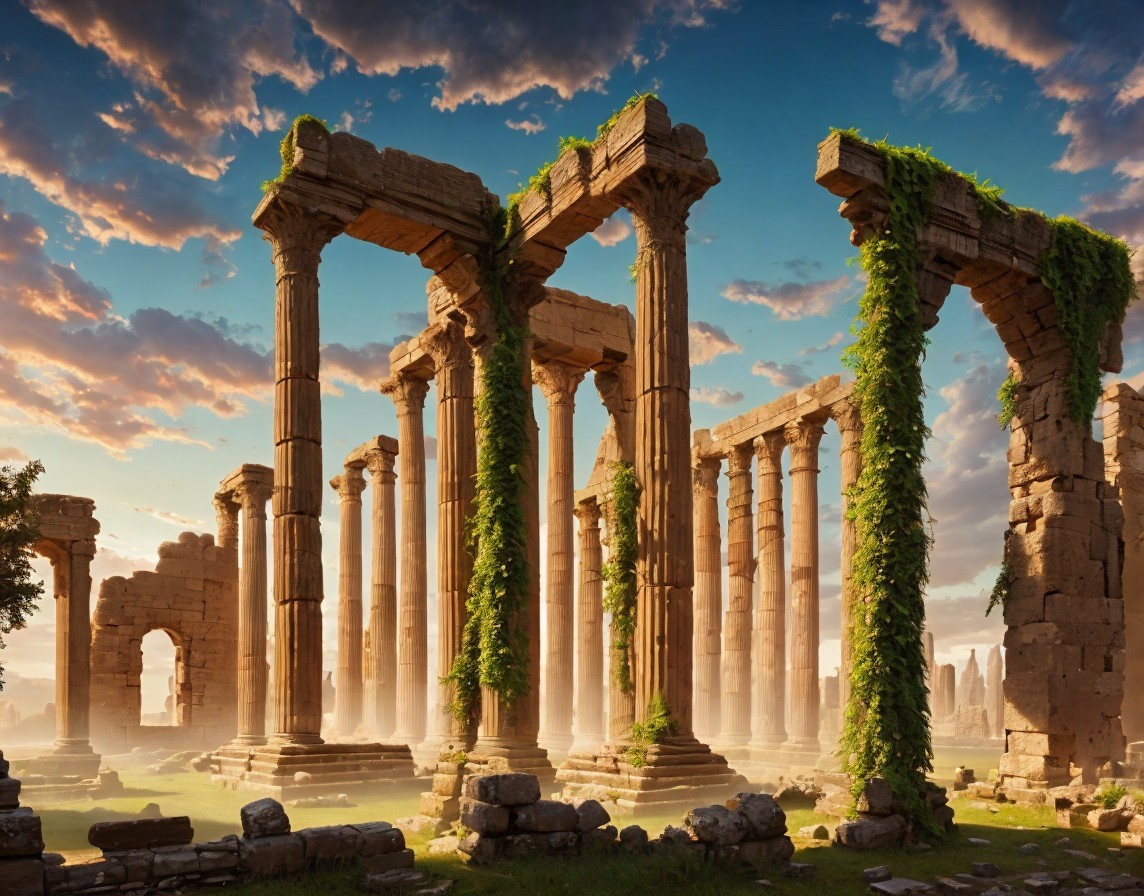 Ancient ruins with columns, overgrown with vines, bathed in warm sunlight against a cloud-streaked blue sky.