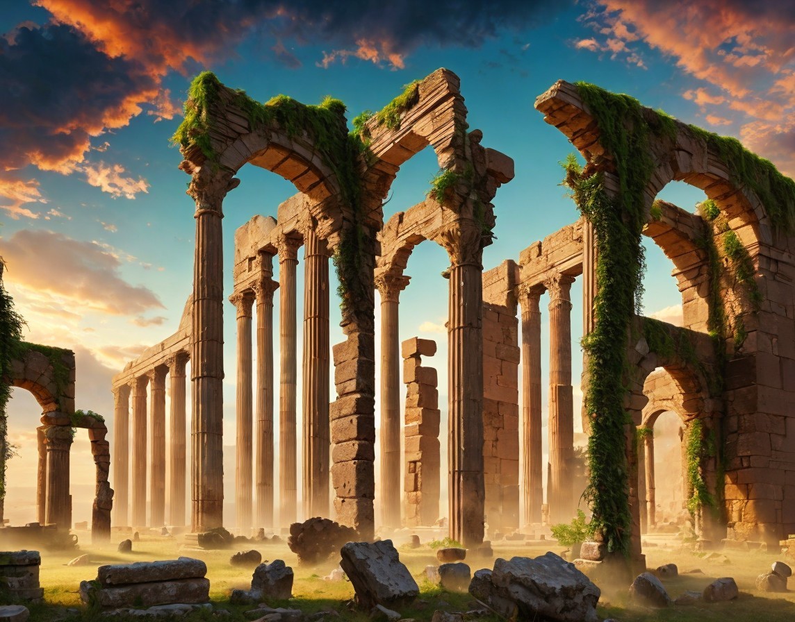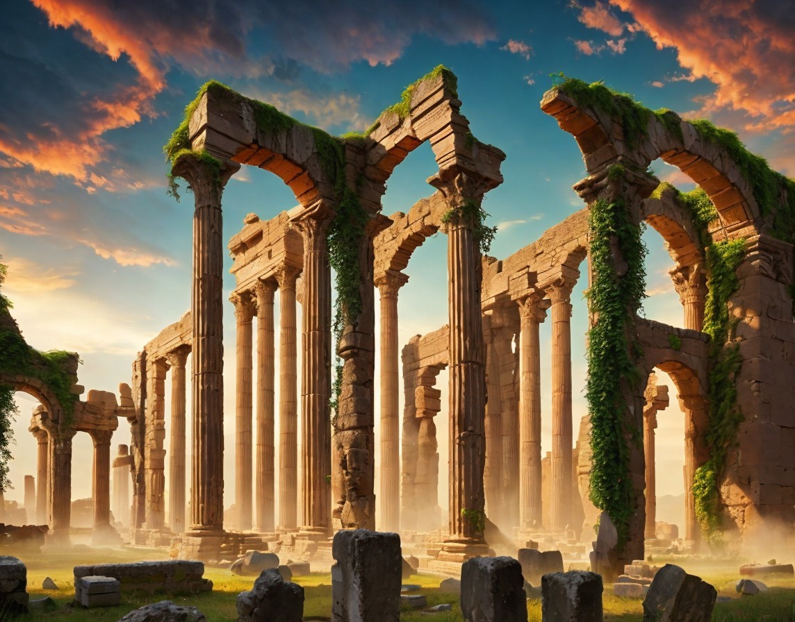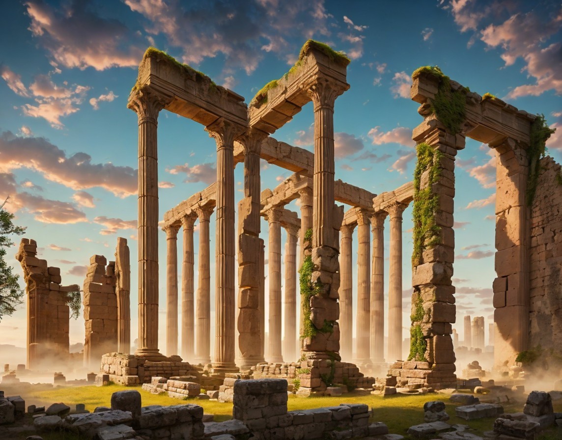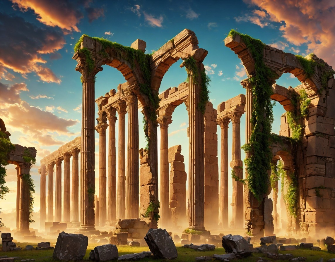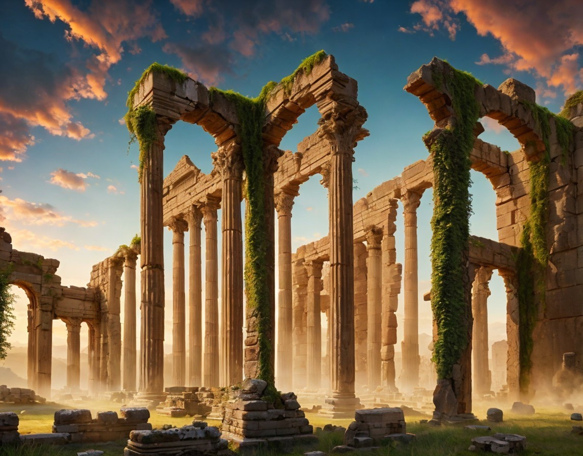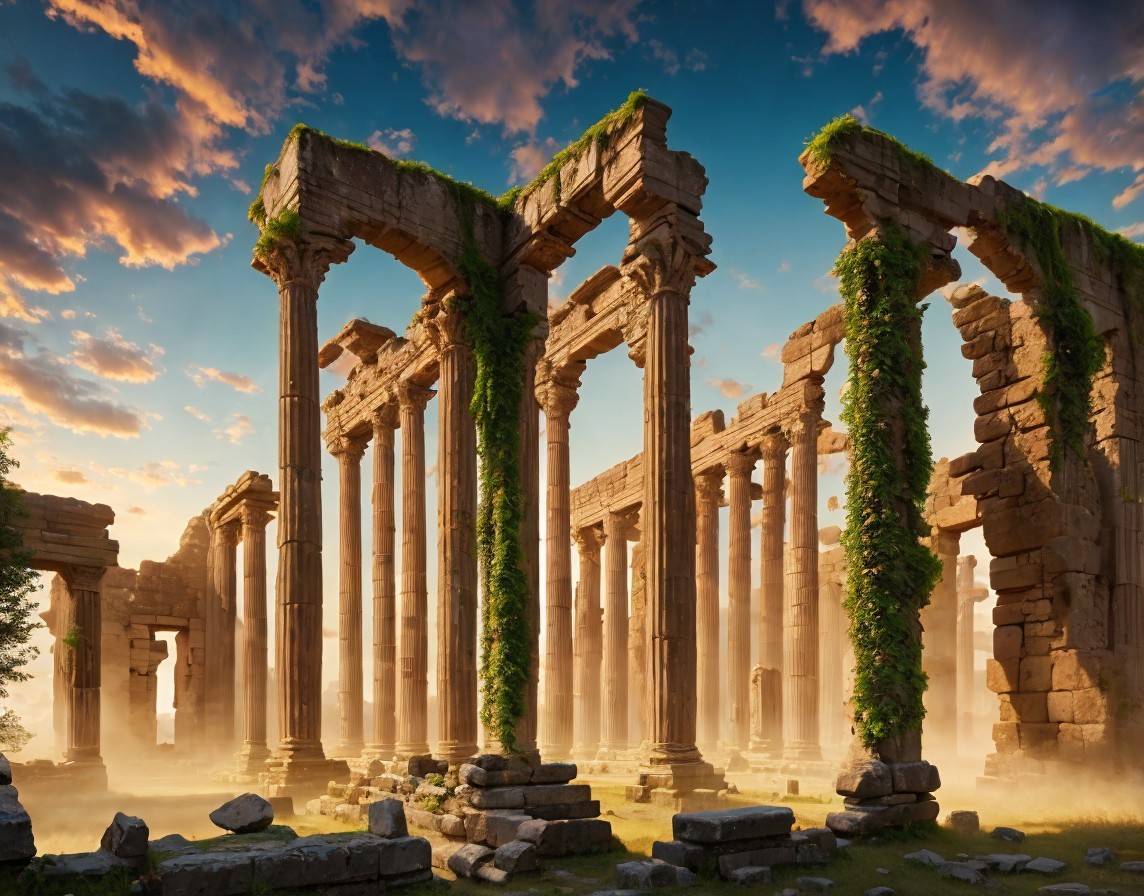 Ancient ruins with columns, overgrown with vines, bathed in warm sunlight against a cloud-streaked blue sky.