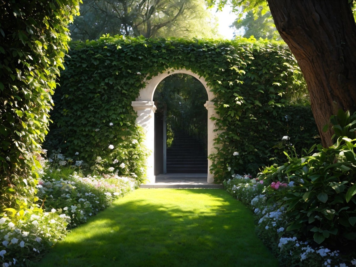 Alrededor de la puerta, la vegetación es exuberante pero tranquila. Se pueden apreciar flores que aún no han terminado de abrirse, con sus pétalos apretados, insinuando una belleza latente. Hay también hojas cubiertas por una ligera capa de rocío matutino que aún no ha sido perturbado.