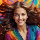A serene young woman with flowing hair adorned with flowers gazes softly. Vibrant orange and pink blossoms surround her, blending harmoniously with her turquoise attire, creating a whimsical, enchanting scene.