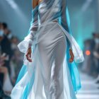 A model gracefully walks the runway in a flowing, light blue gown. The dress features a high slit, contrasting beautifully with the vibrant backdrop and attentive audience.