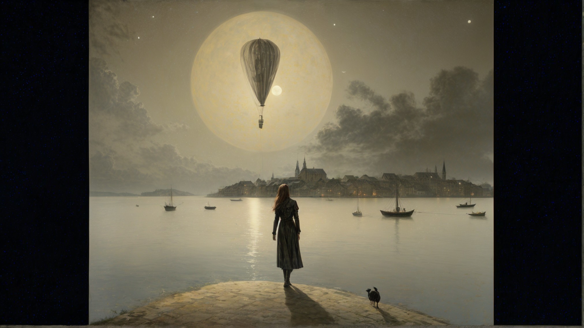 A serene twilight scene features a woman in a flowing dress standing on a shore, gazing at a giant moon with a hot air balloon. Soft clouds and distant boats create a tranquil, dreamlike atmosphere.
