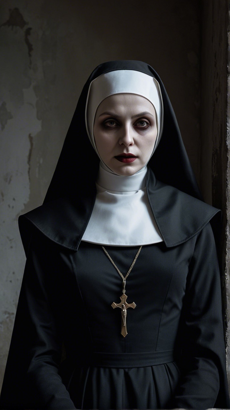 A nun stands in a dim, crumbling environment. Her unsettling yellow eyes contrast with her traditional black and white attire, creating a haunting presence that evokes a sense of mystery and tension.