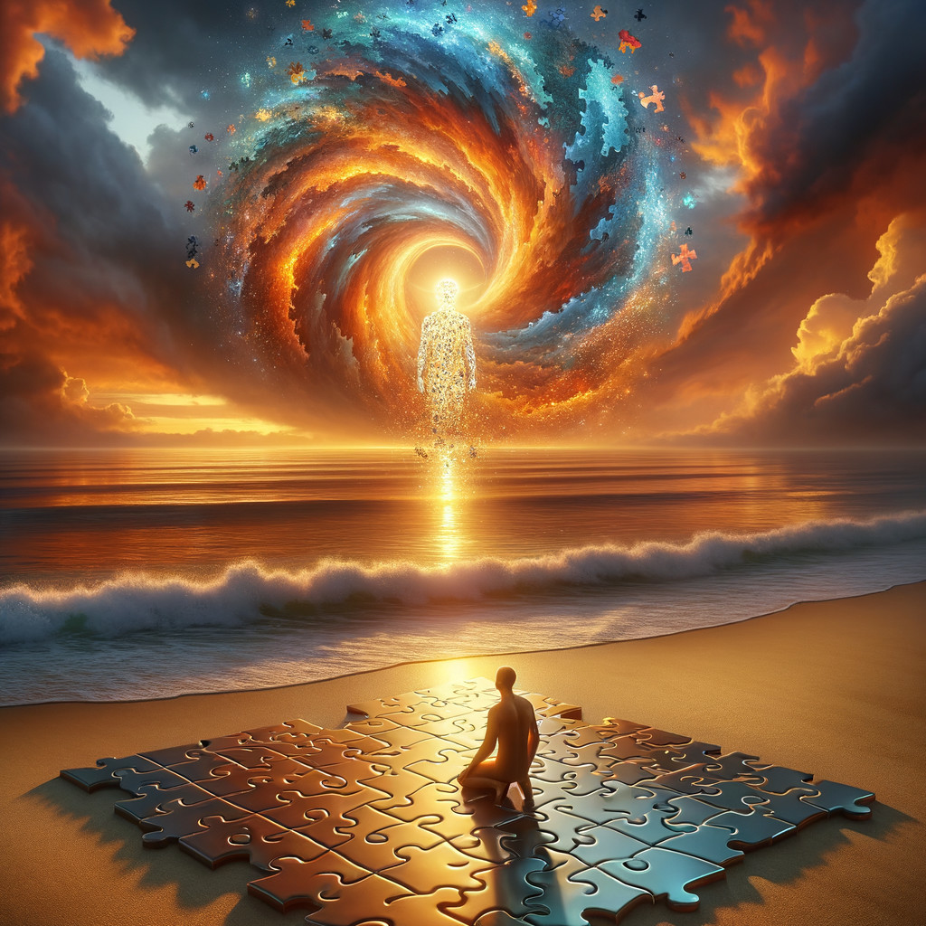 A person sits on a beach, gazing at a surreal sky where puzzle pieces float around a glowing spiraling galaxy with a silhouetted figure.